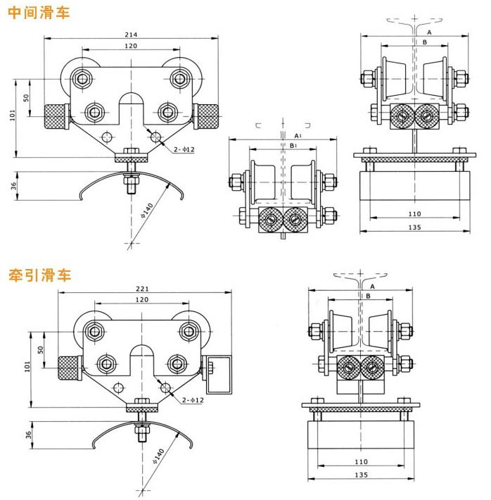 GHC系列工字鋼滑車分為中載荷型、重載荷型、和輕載荷型,因此滑車走輪為Ф80、Ф63、Ф50的三種,承載能力≤50~150kg,每類按托板層數分為單層、雙層、三層,每類中有三種形式,首端為電纜牽引車,終端為固定掛線架,中間為電纜滑車。 GHC系列工字鋼滑車安裝說明: 1、固定掛線架安裝好后,后邊應掛一擋板。 2、調整牽引頭,使小車在整個行程中不碰牽引孔的上下邊緣為好。 3、電纜長度為起重機跨度的1.2倍加8米。 4、調整牽引鋼絲繩,使其長度小于同節電纜長度,運行時由牽引鋼絲繩受力。 5、當電纜直徑不等時,電纜夾間應墊以軟橡皮, 使其外徑基本相同,以便將電纜夾緊。 6、布電纜時,應考慮兩面電纜托板受力均衡。 7、當電纜滑車為二層,三層時,要求相同。 8、滑車裝置上的雙墊圈為調整墊圈,當導軌不合適時,把墊圈放在固定板的內側,以調整軌距的寬窄,出廠時按導軌為I 100*68*4.5、I 120*74*5、I140*80*5、I 160*88*6制造。非標滑車按圖紙加工制作。 GHC系列工字鋼滑車規格參數: