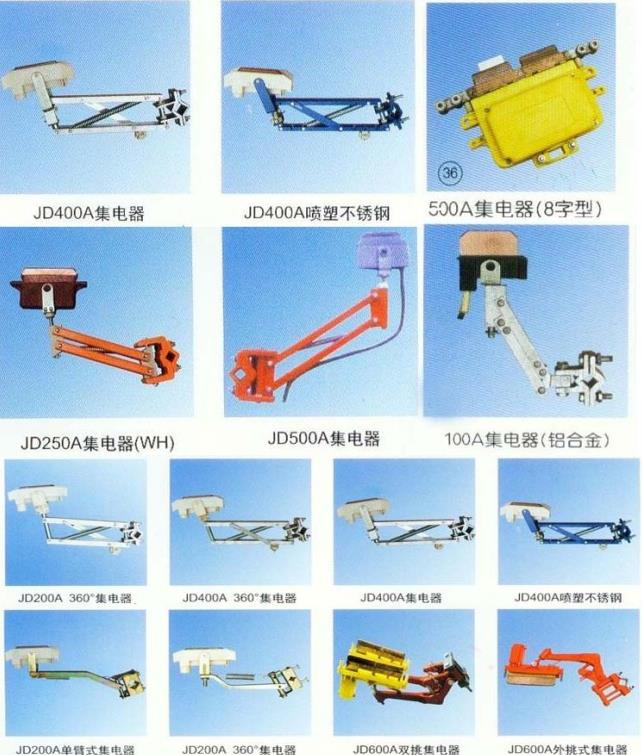 JD系列單級集電器:200A 360集電器、500A集電器、500A 360集電器、500A噴塑不銹鋼、1250A集電器、1600A集電器、500A單臂式集電器、2000A集電器、100A集電器、80A C型集電器、68A C型雙桿集電器、800A集電器WH、鋼體滑線雙頭集電器、鋼體滑線單頭集電器、500A集電器8字型。單極滑觸線集電器。